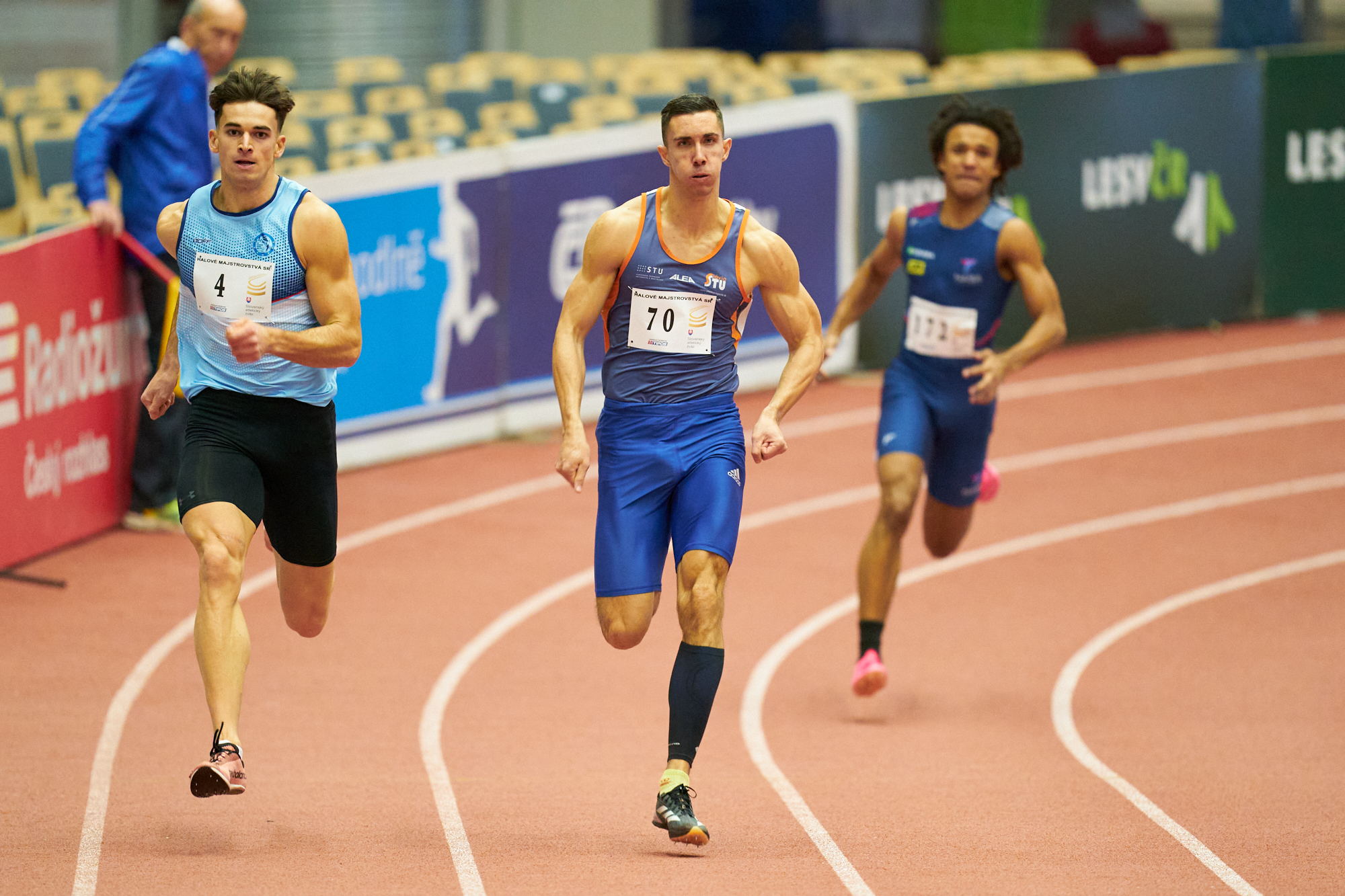 Home›Novinky›59. halové M-SR v Ostrave: Baluch (20,93) vymazal Volkov slovenský rekord na 200 metrov, zlaté double Forster, Čorejová sa zlepšila na 8,22, klubový rekord mužov Slávie STU na 4 x 400 m a Gymerskej juniorský na 200 m›Krška, Marček, macahata HM SR 2025 foto P. macko