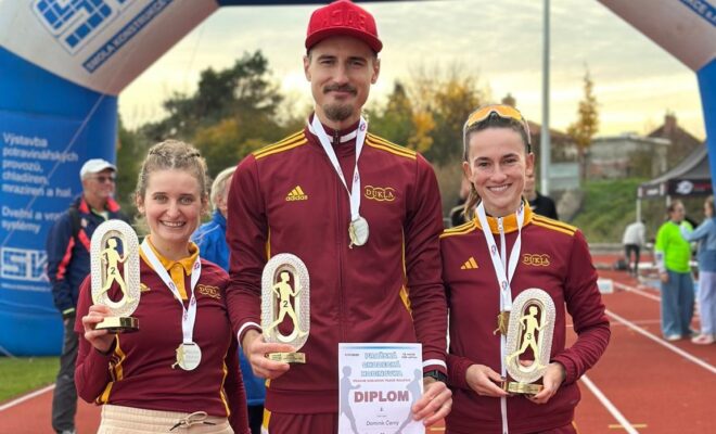 Traja slovenskí chodci na pódiu Pražskej chodeckej hodinovky: Dominik Černý a Ema Hačundová druhí, Hana Černá tretia, päť prvenstiev mládežníkov