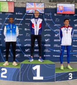 Na archívnych fotografiách najprv Jakub Nemec (216), potom Samuel Kováč (vpravo) s koučom Romanom Oravcom a Ľubomír Hrčka na stupňoch víťazov na veteránskych MS 2024.