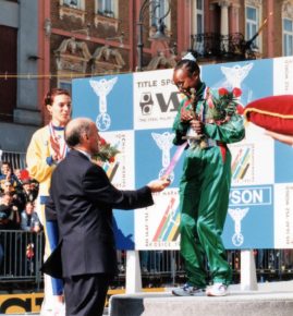 Predseda organizačného výboru majstrovstiev sveta 1997 v polmaratóne Štefan Daňo blahoželá zlatej Tegle Loroupeovej z Kene.