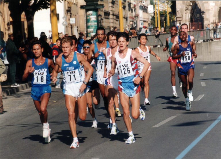 Muži na MS 1997: V popredí v tom čase ešte úradujúci svetový šampión Baldini (s číslom 71), vedľa neho dodnes historicky najlepší slovenský maratónec a polmaratónec, košický rodák Róbert Štefko (126).