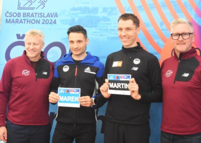Na snímkach Marek Hladík (na titulke vľavo) a Martin Rusina, plus organizátori ČSOB Bratislava Marathon Jozef a Peter Pukalovičovci.