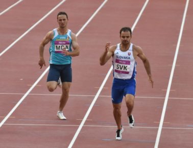 Tomáš Benko v “civile” a v čase aktívnej kariéry vo víťaznom behu na 100 m na Európskych hrách 2015 v Baku.