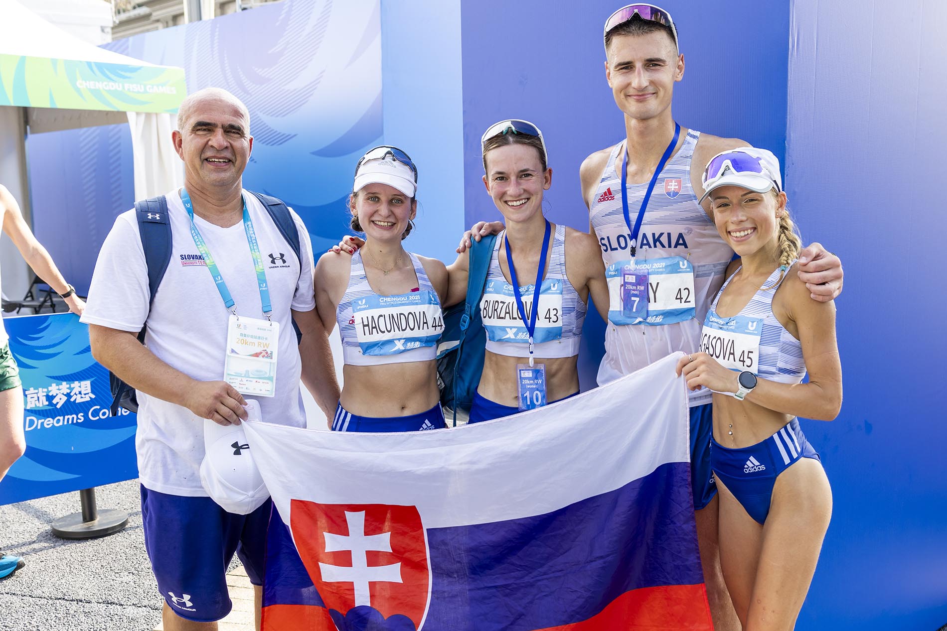 Home›Novinky›AKTUALIZOVANÉ - Svetová univerziáda: Striebro pre slovenský chodecký tím žien (Burzalová, Ragasová, Hačundová) na 20 km, Černý v mužskej súťaži siedmy a oštepár Kubínec vo finále 9.›R. Benčík, Hačundová, Burzalová, Černý, Ragasová SU 2023 foto R. Benický