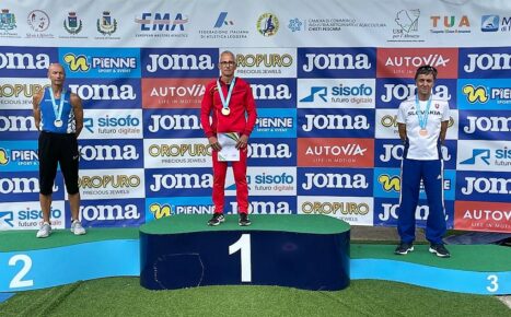 Už svoju druhú medailu v Pescare si vybojoval Jiří Koukal ml. v kategórii M40 (40 až 44-roční), ktorý po striebre v hode kladivom získal bronz v hode 15,88 kg vážiacim bremenom výkonom 15,97 m z piatej série, ktorým o 17 cm predstihol dovtedy tretieho Poliaka Skibického. Štyridsaťjedenročný vrhač dubnického Spartaka bral už ôsmu medailu z veteránskeho vrcholného podujatia, na MS bol dvakrát druhý a na ME má bilanciu 3 – 2 – 1.